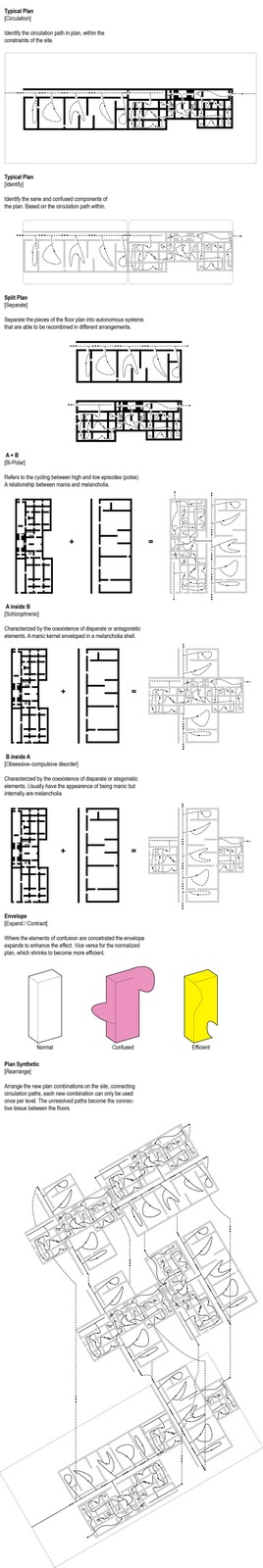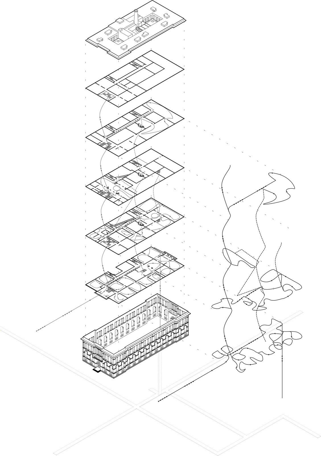 In plan this produces an archipelago of architecturally imbued areas that allow the user to move between floors while also creating shortcuts thought the generic plan.